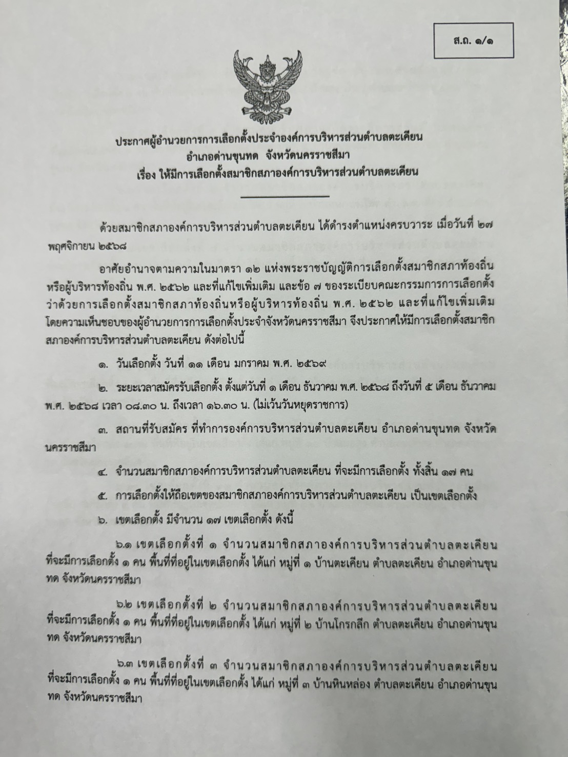 ประกาศให้มีการเลือกตั้งสมาชิกสภาองค์การบริหารส่วนตำบลตะเคียนและนายกองค์การบริหารส่วนตำบลตะเคียน รับสมัคร ระหว่างวันที่ 1-5 ธันวาคม 2568 เวลา 08.30-16.30 น. (ไม่เว้นวันหยุดราชการ) |