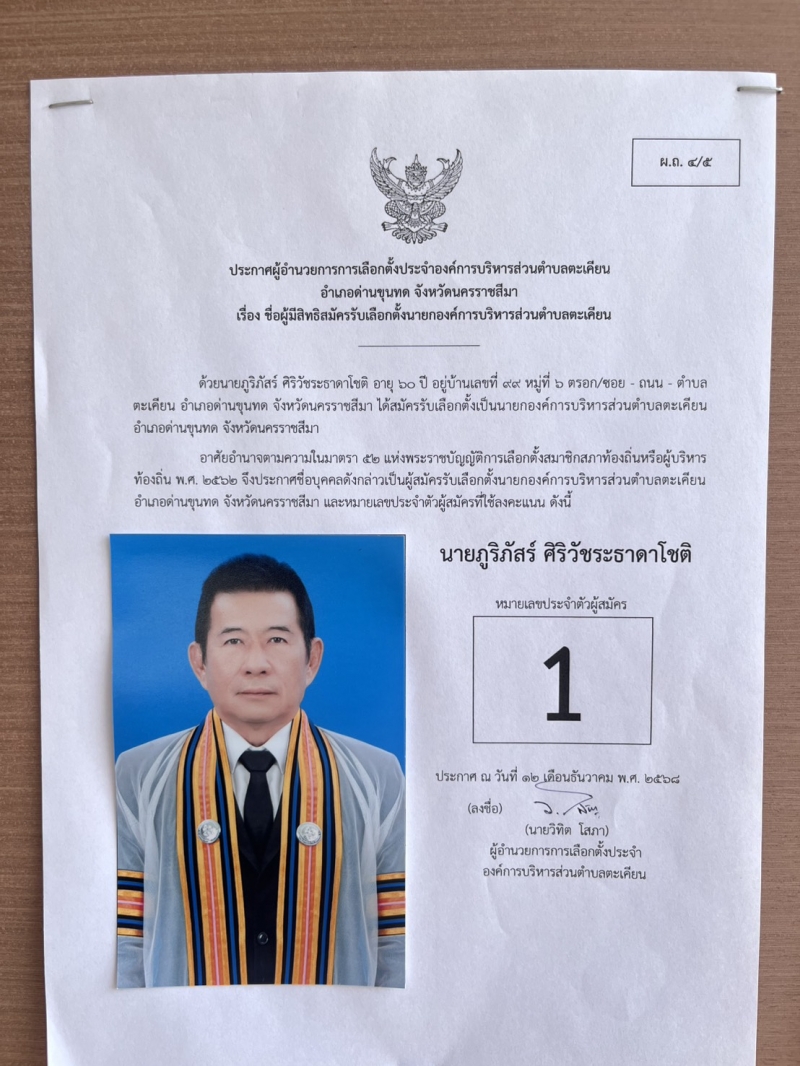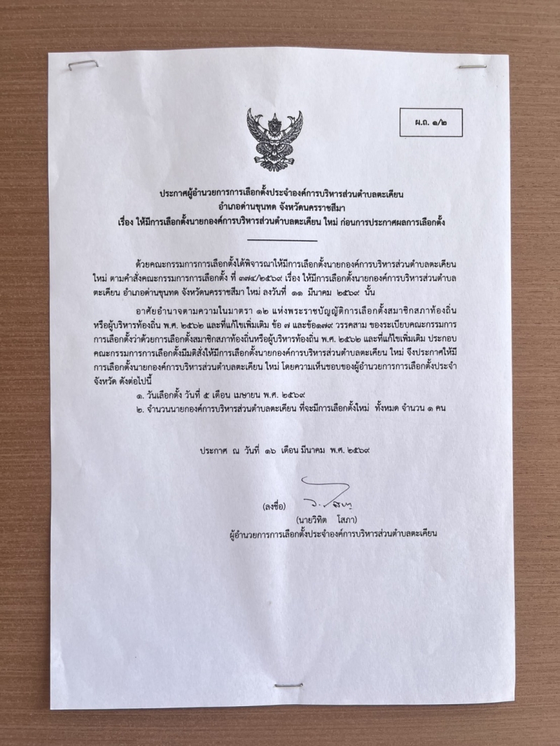 เรื่อง ให้มีการเลือกตั้งนายกองค์การบริหารส่วนตำบลตะเคียน ใหม่ ก่อนการประกาศผลการเลือกตั้ง