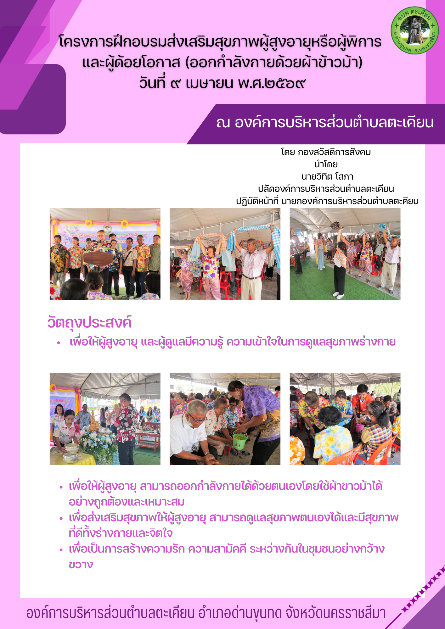 กองสวัสดิการและสั่งคม จัดโครงการฝึกอบรมส่งเสริมสุขภาพผู้สูงอายุหรือผู้พิการและผู้ด้อยโอกาส (ออกกำลังกายด้วยผ้าข้าวม้า)